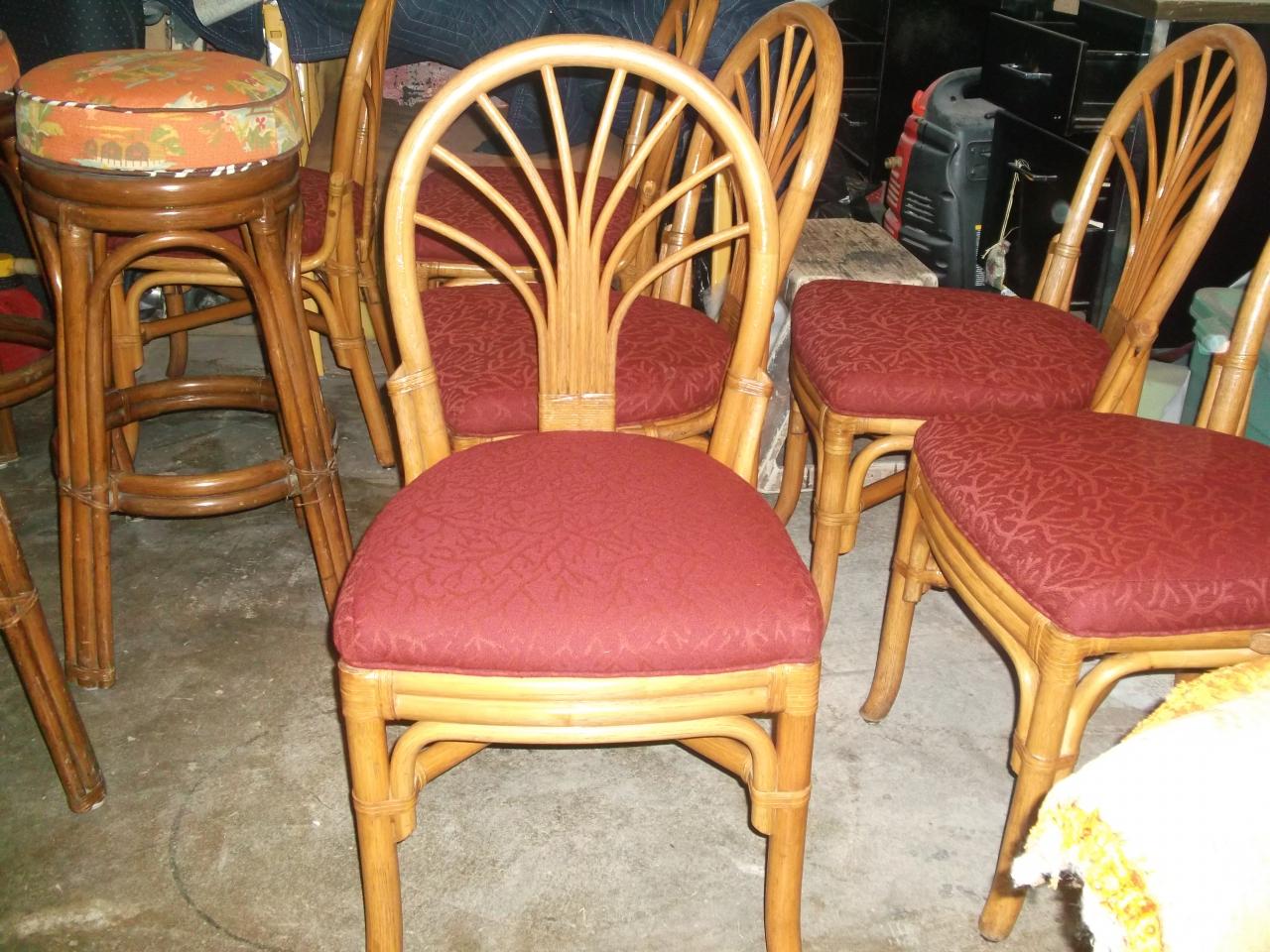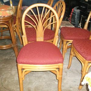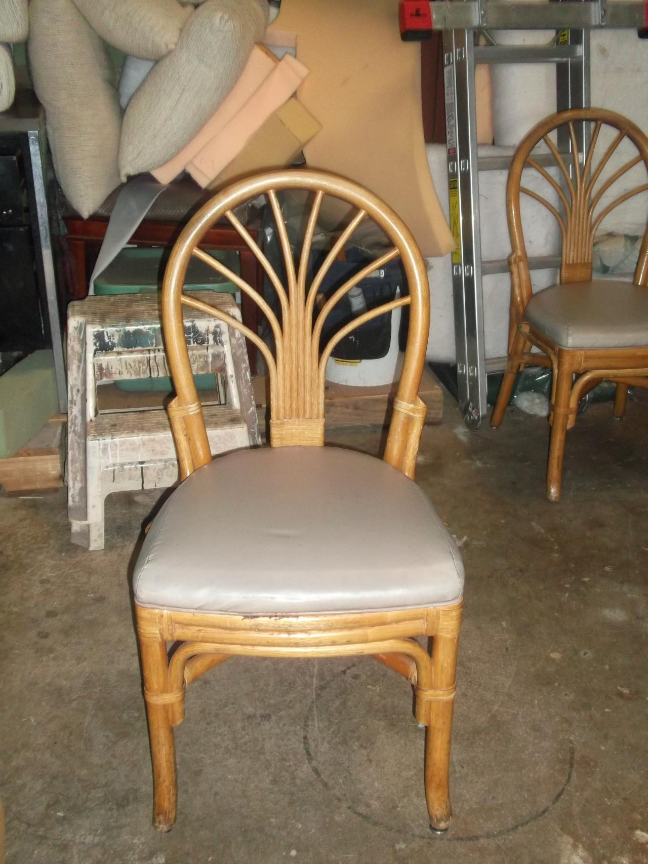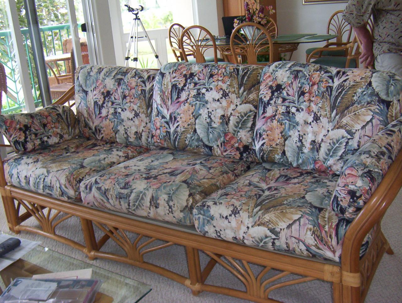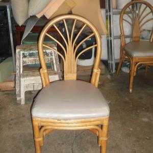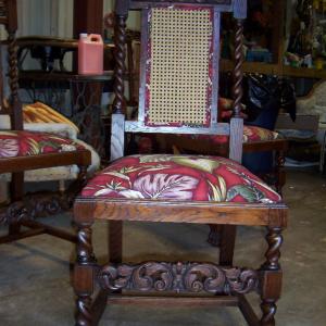 After strip it down apply new stain of Early American finish and the back rest change to mesh cane double cording triming same color as seat and the seat was change to floral Hawaiian bark cloth print.